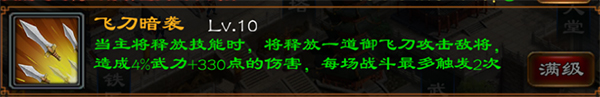 飞刀暗袭,伤害型技能,满级后效果在主将释放技能的时候给予对方4%武力+330点的伤害,每场战斗最多触发两次。