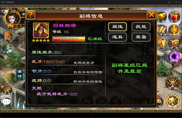 接下来要介绍的是紫将——羽林郎将。羽林郎将升至满星后的属性是为自己的主将增加540点武力,并削弱对方主将900点武力。