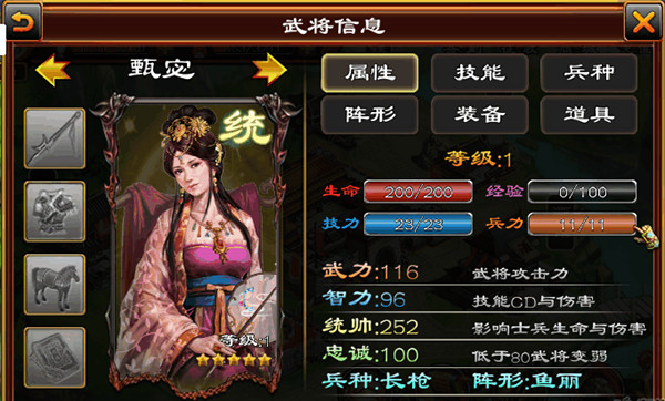 最后我们来看一看甄宓!三国里的妹子不多,统将更是少之又少。甄宓的属性还是很不错的,圣光和振奋都是统帅神技!