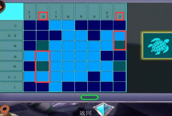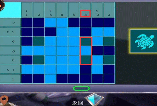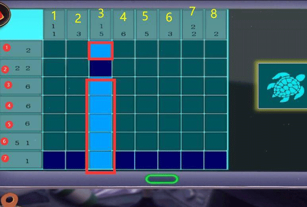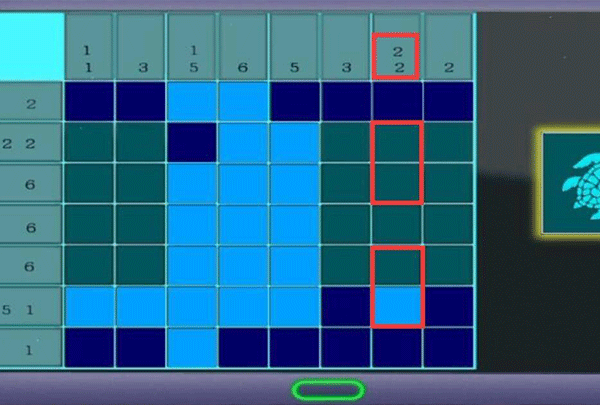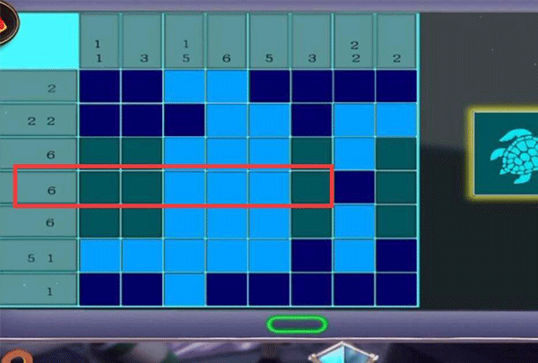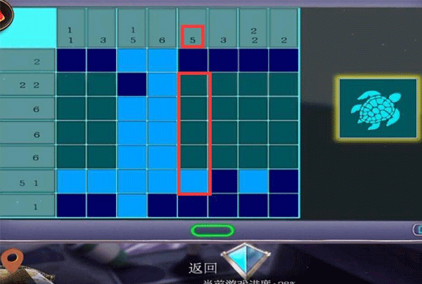 12、第二列数字为3,也就是连续亮起三块瓷砖,第四、六块瓷砖是固定亮起了的,所以只能选择点击第五块瓷砖。而第八列数字为2,连续两块瓷砖亮起,所以点击第八列第三块瓷砖即可。