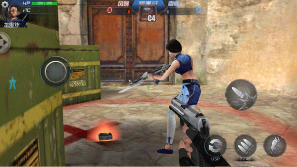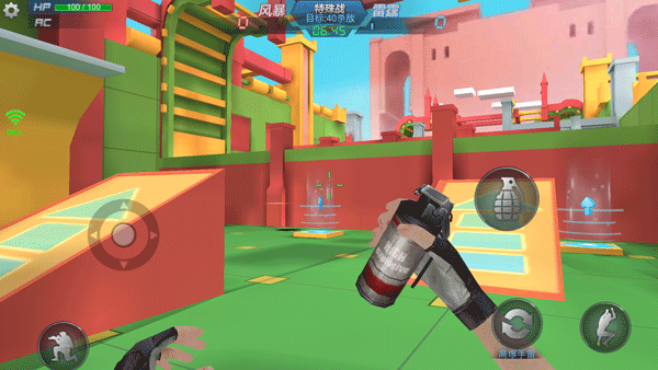 游戏画面左下角有一个圆圈状的虚拟按钮,右下角有个未显示的虚拟按钮,玩家通过滑动虚拟按钮控制人物的动作。其中左下角的虚拟按钮控制移动右下角的虚拟按 钮控制准星和射击。同时,在画面左上角设置按钮中有战绩查询、游戏设置、键位设置功能,左下角有蹲下按钮,画面右侧分布有跳跃、切换武器、换子弹、扔手雷 等按钮。