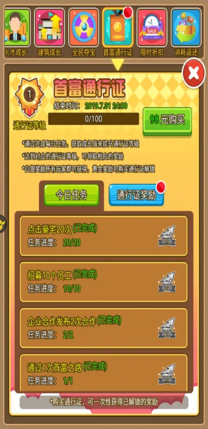 好了最后我来说一下这个游戏呢氪金其实是可以氪的,无论大氪还是小氪,小氪呢每天一元买礼包获得累天充值也很丰富。还有就是永久卡也是可以省去我们投资点击,这个也挺划算的,长期玩的话。所以还是挺建议的氪下金的。最后的最后给大家附上一个新区冲榜的顺序(也可以说是常规顺序吧)赚速增幅 人才能力增幅 家族经验加上商战 宴会 单人金币加上家族金币消耗 钻石消耗 投资次数消耗,好了就是这几个榜了。其实上面我也也提及到怎么玩这些个榜了。认真发掘一下就好了。最后的最后的最后,在此祝所有看本攻略的玩家能有所收获,也祝所有玩家能玩的开心