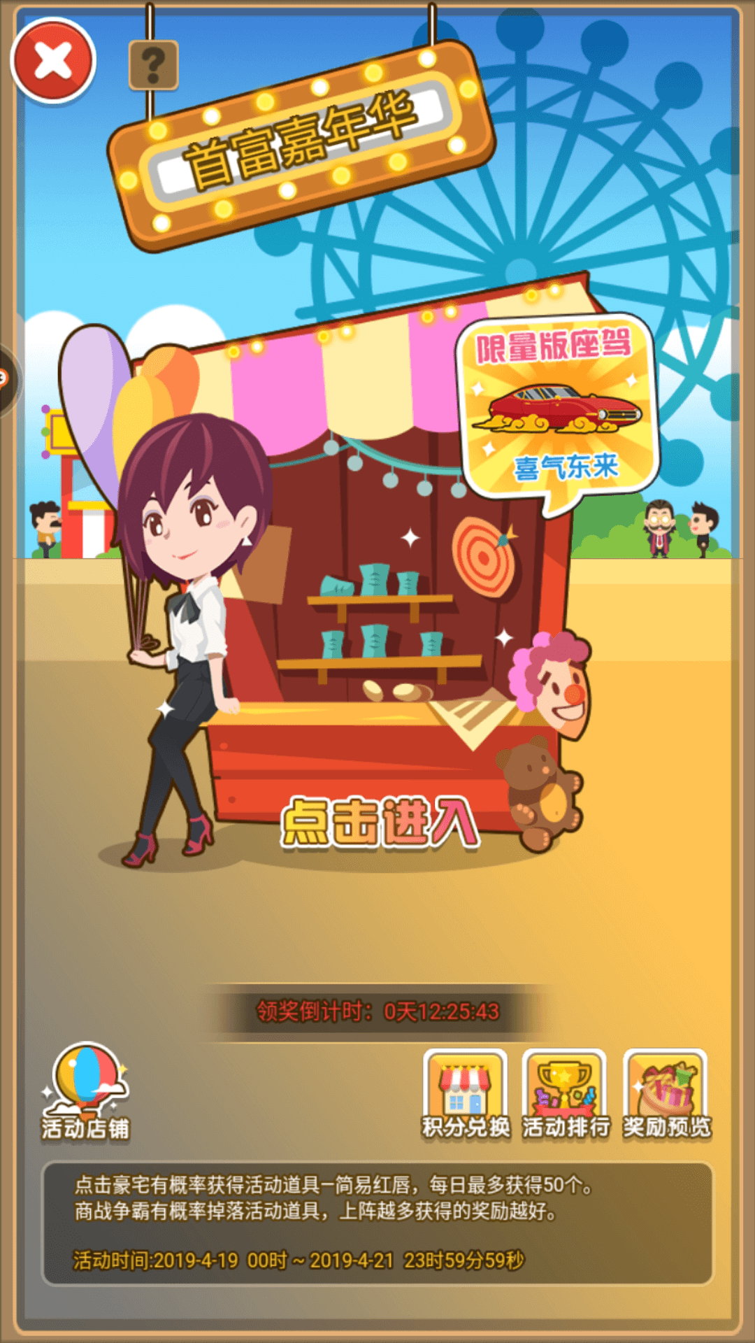 金融战争也聊完了我们接下来来聊下这个游戏目前来说的一个小活动首富嘉年华,这个活动很划算很划算。首先这个活动的道具来源可以是豪宅点击还有商战争霸掉落。据我自己本人统计就单纯来说不花钻石也可以达到6000多分。而6000多分换建筑卡就是60多张了。本身这个活动就是划算的。服排名奖励丰富这个前提你能上的去,本区的奖励也不错。还有这里买建筑卡比商城买礼包划算了些。所以不能错过!尤其遇上本区钻石消耗加上这个的话那真的得是大花特花了。在这里补充一点,钻石的基本用处就是买建筑卡了。所以要攒些钻石卡。
