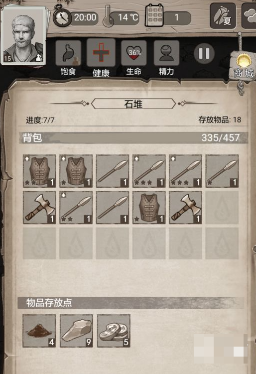 第三关可以先吃点东西,然后再来到丘陵,丘陵这有非常大的几率会掉下来物品,将物品进行采集以后再重新回营地吃一点东西,再采集石块,将绷带给制作出来,最后再睡觉,第四关可以将火堆给建造出来,火堆建造出来后就可以制作烤肉了,接着再去灌木丛进行采集,回到营地以后再对烤肉和绷带进行制作,制作好后就可以去睡觉了。