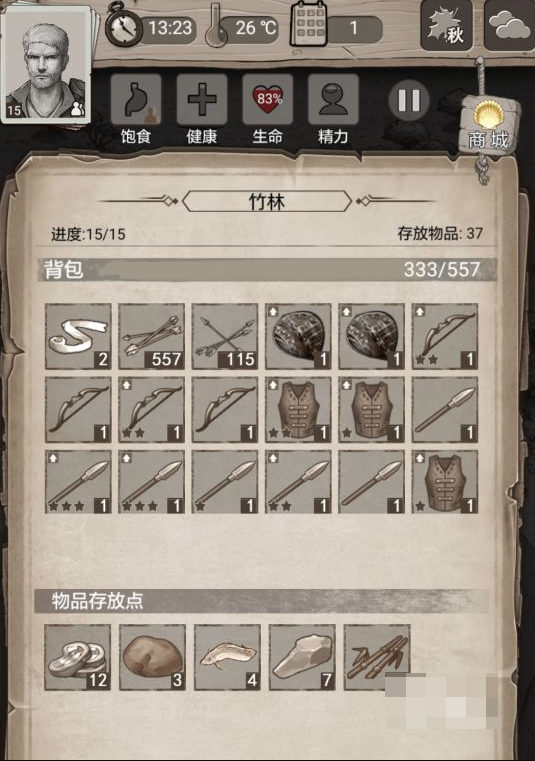 后面的关卡都大同小异,难点的地方大家只要注意好冬天就可以了,冬天的难度会比较高,需要准备好五天的食物,同时要多去灌木从,竹林和石堆将材料打回来,然后睡觉,第二天的时候要带上稿子前往胡桃树林,将胡桃树林打完后再去矿坑,把矿全部挖走,做好这些准备就可以将天使军的营地打下来,天使军的营地非常肥可以帮助大家通过这关。