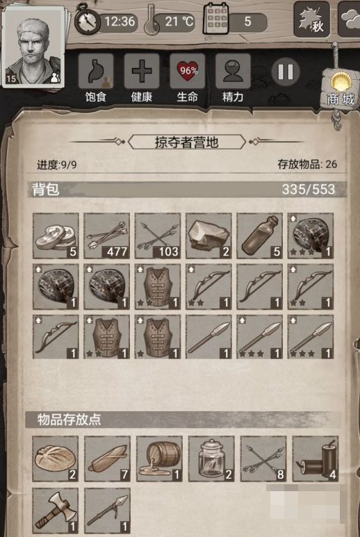第五天发现掠夺者的营地,这个营地最好是要推掉的,如果时间不充足的话可以每天推一点点,后面角色回到小屋的话会触发一个剧情,角色离开小屋的话还会触发天使军的进攻,这个天使军的话是有两组的一共会有六个,利用武器将他们打败以后再回一趟家里,带上装备前往西部的沼泽,如果打完沼泽地带还能有更多的血,可以打灌木丛这样可以开启亚麻的循环点,最后就可以回家睡觉了,这里要注意不需要进行迁移,同时玩家们也会发现小偷开始越变越多,如果玩家担心小偷将东西偷走的话,可以将重要的物品放到包里,小偷是不会去偷包里的东西的。