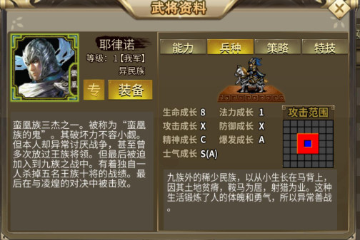 耶律诺自带的十字穿透使他的清兵不比皇非差,初始兵种x攻防,培养需要的果子最少,不依赖套装,性价比极高,但精神略低,对于普通难度,综合指数五颗星。