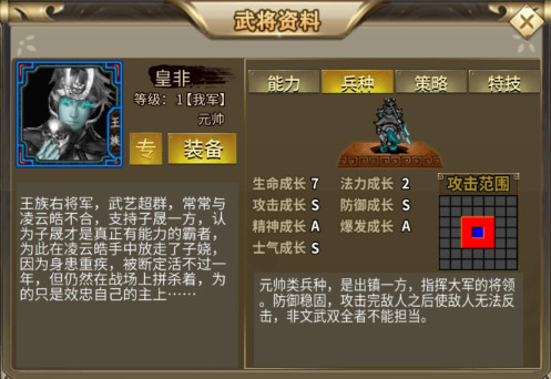 皇非绑定了自己的套装,武器奋战4到奋战7(一阶二阶三阶和圣武)辅助带二动马清兵速度很玄学,三五回合就可以清的差不多,但初始攻防s,培养到z需要的果子更多,又因为普通难度敌军没有神将,掩盖了他打boss困难的缺点,综合指数四星半。