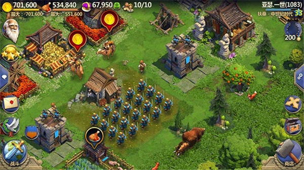 2.战斗的兵种的选择可根据每次的作战目的进行自由搭配。对于掠夺资源可以骑兵突击队为主要兵种,而面对防御建筑多的敌对文明则需要更多的骑马兵,获取全胜红利奖励则需要各类兵种合理搭配,且对于战斗需要策略的进行布局。