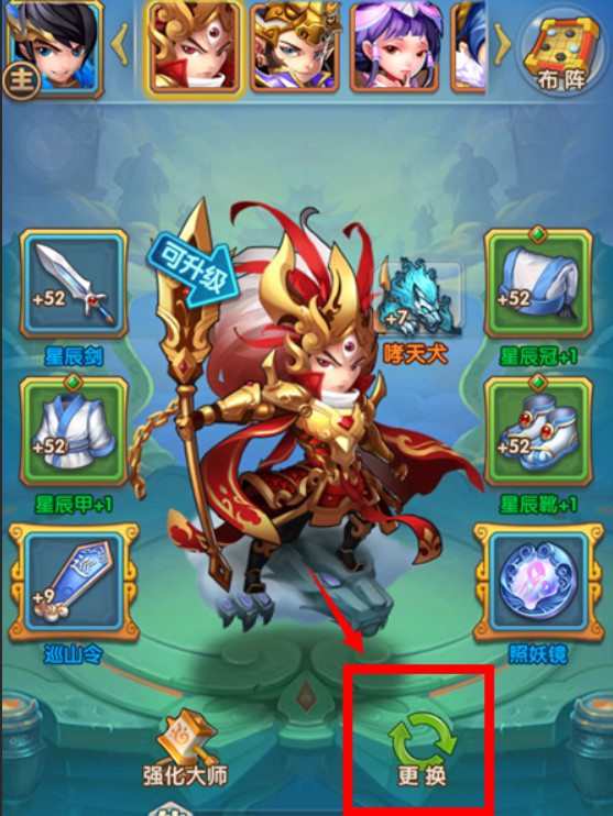 2.另外,主角是不能替换的。更换武将的方法:在“阵容”界面,神将人物右下角有“更换”按钮,点击后即可选择要上阵的神将。