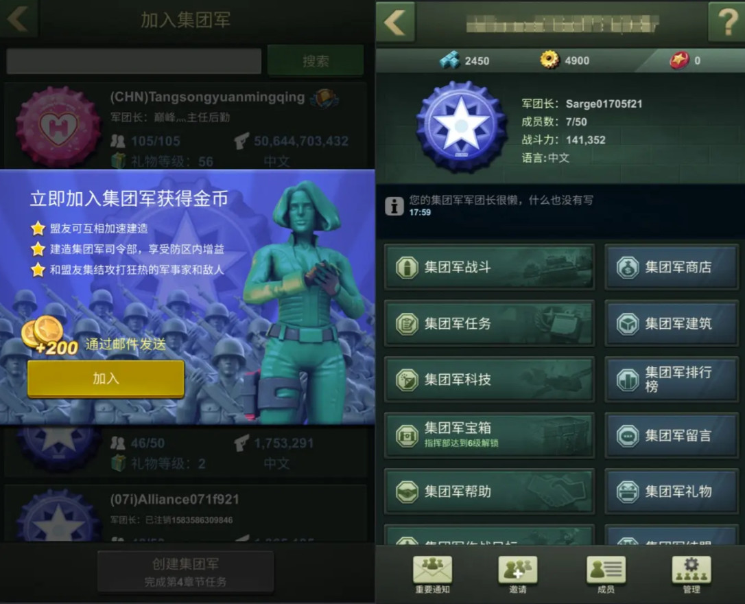 加入一个活跃的集团军非常重要,集团军不仅可以给集团军领地内的指挥官提供资源采集、资源生产增益、提升作战和防守能力;更重要的是你将会获得一群团结的战友,为你提供资源、礼物和作战帮助,与你并肩作战。要知道,战场可不是一个人的游戏!
