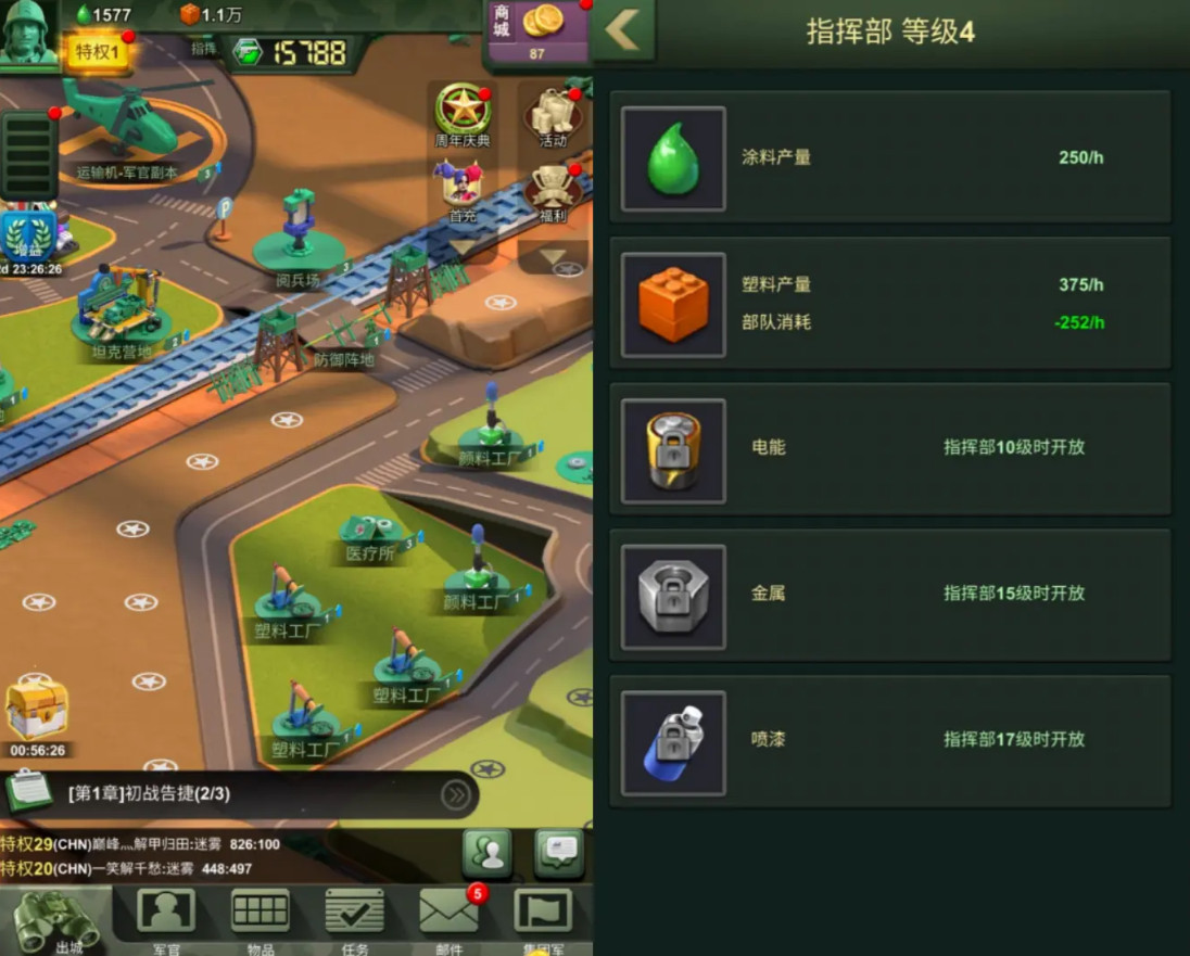 随着游戏进度提升,我们可以解锁地块布局我们的涂料、塑料、电能、金属、喷漆五类工厂用来生产资源,同时也会解锁军用帐篷、医疗所用来提升士兵训练效率和救治伤兵。我们在布局的时候尽量平衡每个设施的数量,并花点时间保持每个设施都能在最高等级,这样每天我们获取资源的效率将会大大提升!