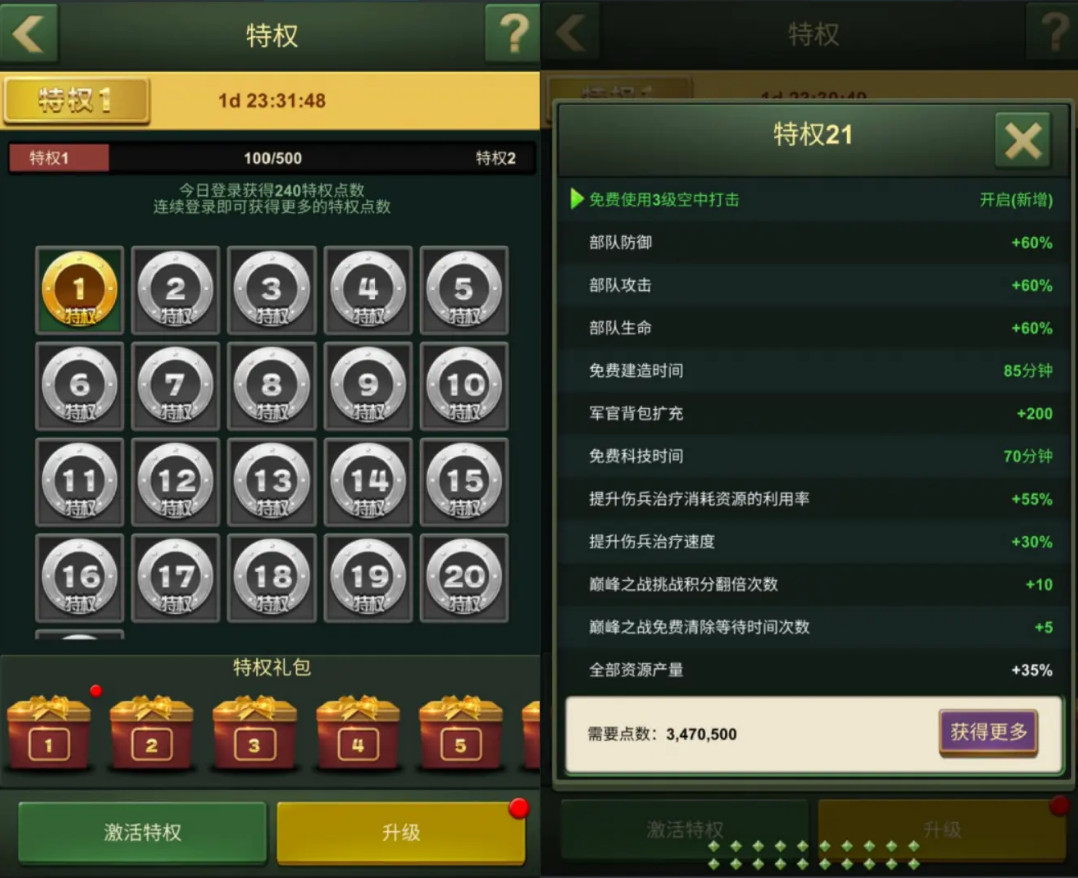 在指挥部界面左上角有个“特权”按钮,我们可以通过成长过程中获得的特权点数来提升我们的特权等级,特权等级越高,在特权激活状态下我们享受到特权加成也就越多,这对于我们快速成长非常有帮助!