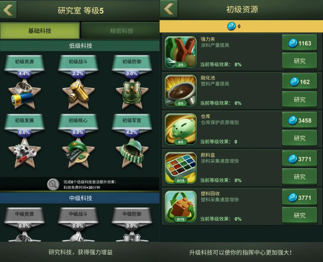 研究所研究能够永久性提升我们生产养成战斗的全方面能力,所以在新手期如何高效进行研究非常重要!前期我们主要针对基础科技进行提升,比较高效的加点方法是根据你的发展策略进行加点:例如你是喜欢通过战场采集掠夺来加快发展,可以优先提升战斗和发展模块里的相关加成;如果是喜欢通过发展城内经济,可以优先选择资源模块;另外,建议优先把低级科技的六个模块都升满再开始研究下一级科技,这样可以获得额外科技研究时间加成,为后续科技研究节省时间。